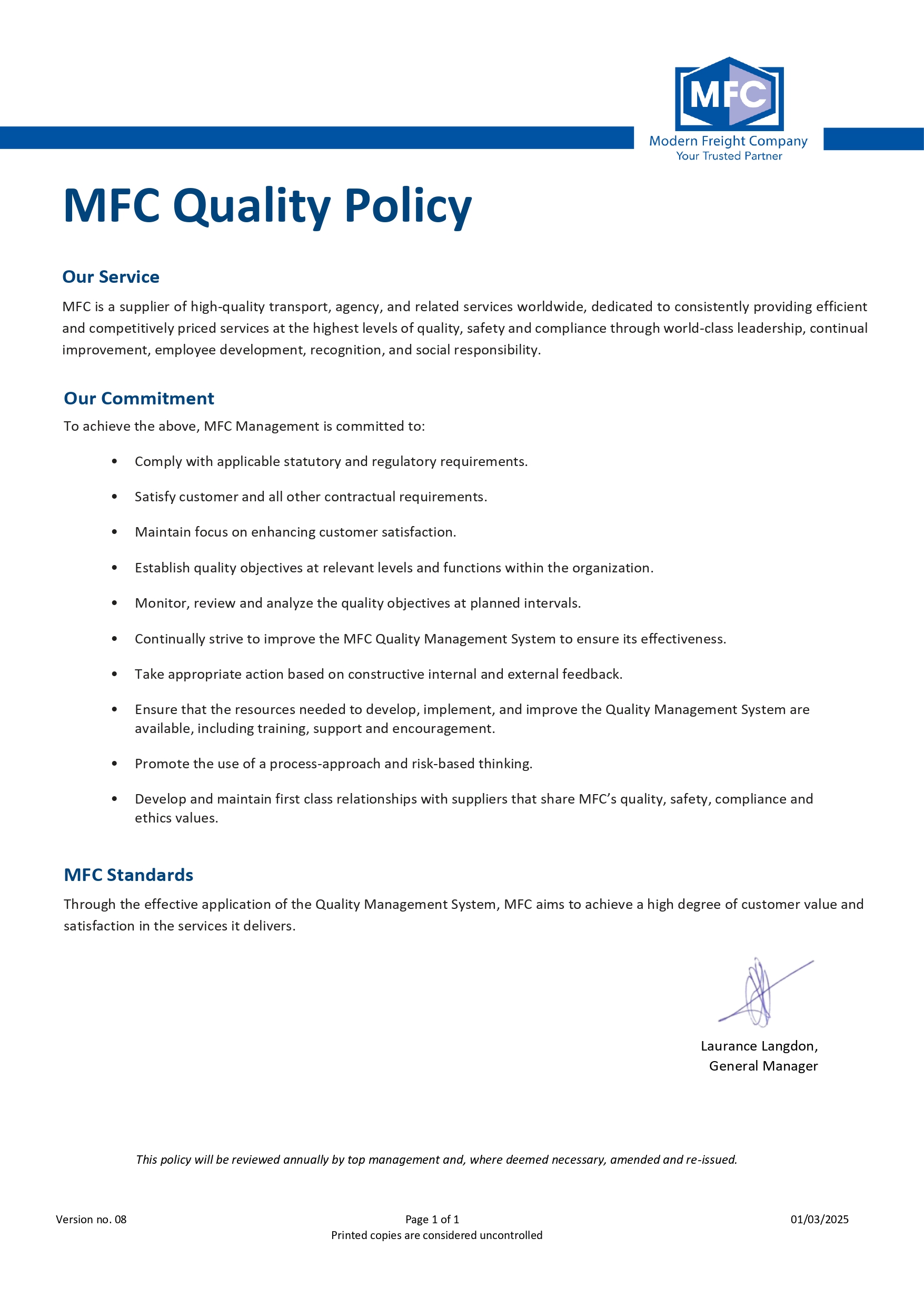 MFC is an associate member of the Maritime Anti-Corruption Network (MACN), a global business network comprised of like-minded companies committed to promoting compliance with anti-corruption law. MACN’s vision is to work towards a maritime industry free of corruption that enables fair trade to the benefit of society at large.